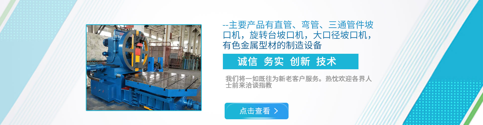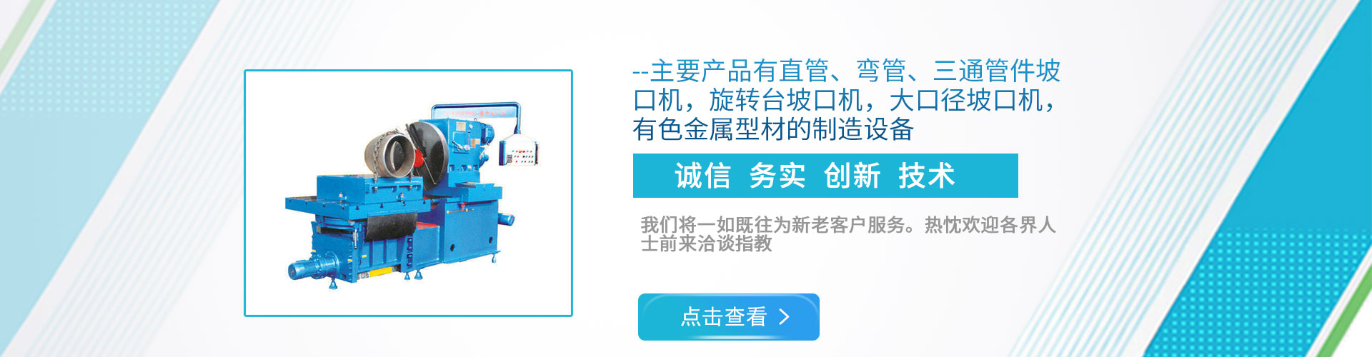 公司現(xiàn)下轄兩個(gè)分廠,一分廠主營(yíng)電動(dòng)管道坡口機(jī)和焊接設(shè)備,適用于造船、電力工程安裝、石油、化工、鍋爐廠、冶金以及鋼鐵行業(yè);